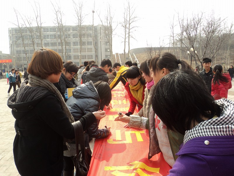 为在我院大力推广雷锋精神,加强雷锋精神在同学们心中的地位,增加同学们自觉帮助他人的优良美德和积极向上的生活方式。我院院学生会及各系学生会相继组织开展了学习雷锋精神签字活动。号召全校师生广泛、深入地开展“向雷锋学习的活动”,以实际行动为学院的发展贡献自己的力量,让同学们人人学雷锋、天天有雷锋、使雷锋精神遍布校园;把学习雷锋当成实现人生价值的一个过程,让校园成为一个更加温暖和谐的家园。(院学生会)