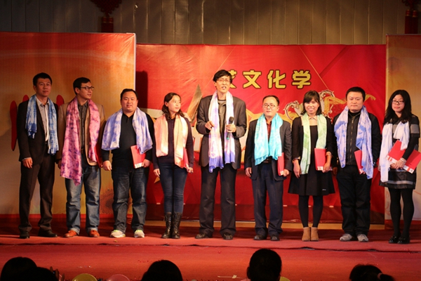 本次晚会,首先由郭常青主任致辞,宣布颁奖仪式正式开始,之后系学管副主任李红霞宣读体育赛事获奖名单,我院副院长梁菊红为获奖者们颁奖;我系教学副主任申万意宣读奖学金名单,青岛艾文化学助剂有限公司袁桂萍副总经理为奖学金获得者们颁奖,陈英华老师也在执教的最后一年做了精彩的演讲。随后啦啦队带来的精彩开场舞拉开了晚会的序幕,杨娜老师的《即兴表演》与徐兆杰老师、欧阳丽老师等10位老师带来的集体朗诵带动了现场的欢乐气氛,赢得雷鸣的掌声。由张震红老师演唱的歌曲把晚会带入了高潮。创新的国标舞、鬼步舞更是展现了同学们的多才多艺……晚会以全体演员及主持人的一首《相亲相爱一家人》落下帷幕,为艾文化学人才培养资金项目系列赛事和励志助优奖学金画上了一个圆满的句号。