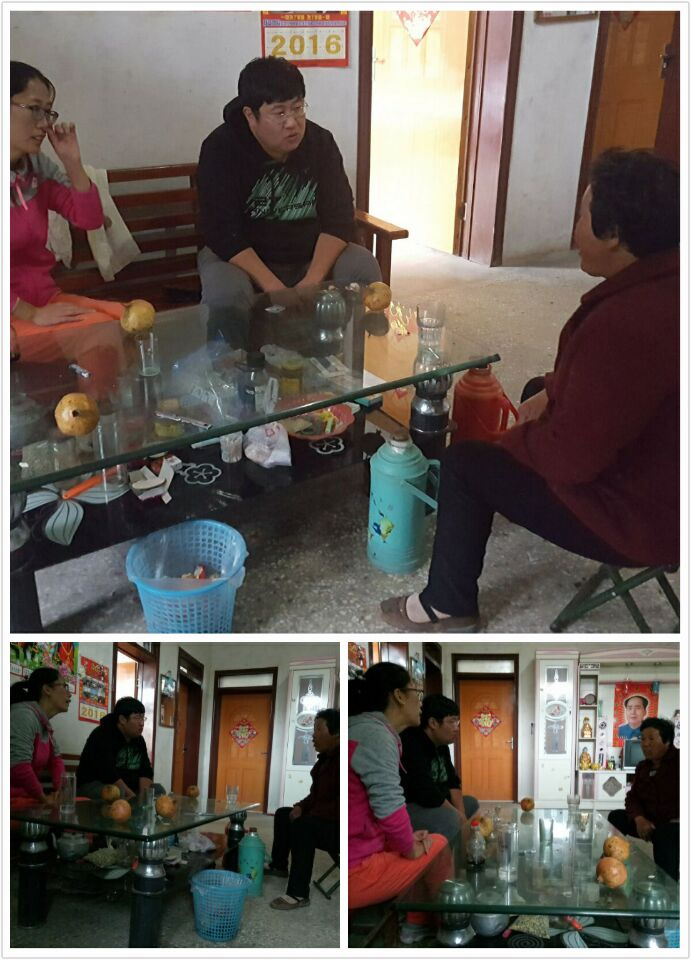 此次活动的受访区是在我系贫困生密集区菏泽地区,涉及到曹县,定陶区,牡丹区的五名贫困生,在菏泽市曹县桃源镇马屯村,我们来到了16物流管理一班刘孟冲同学家中。该同学是单亲家庭,妈妈有腰间盘突出做不了重活,家中人口多,劳动力少,还要负担孩子上学的学费和高额的医药费,所以家庭经济十分困难。其他与之家庭相似的同学不在少数。在学生家中,我们对学生的家庭情况做了详细了解,将我院的政策及家长关心的问题做了汇报与解答,并且对家长保证我系会全力解决每一个贫困生的困难,使他们与其他同学一样安心学习、茁壮成长。同时鼓励学生克服家庭经济上的困难,努力完成学业。
