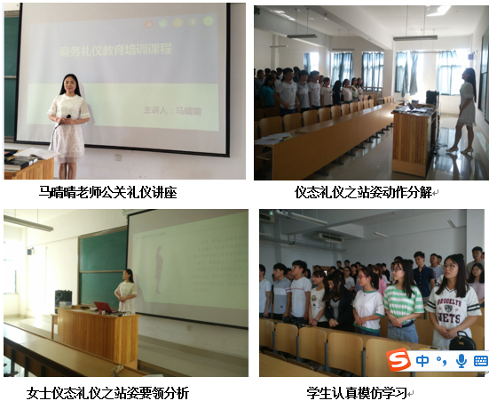 在我院学生实习和毕业来临之际,为规范和重塑学生言行举止,修炼学生自身气质和内涵,提高心理承受能力和与人沟通技巧,提升学生整体形象和综合素质,使学生能更好更快的适应工作环境和岗位,5月26日下午,轻化工程系食品营养与检测教研室邀请到马晴晴老师,为即将跟岗实习的15级学生开展了一堂别开生面、有趣实用的公关礼仪讲座,讲座在J7405举行。