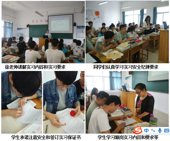 动员大会上,徐老师针对15级学生实习目的要求、实习内容、实习方式、实习安排、考核方式和实习报告等进行了详细的讲解和梳理,并且重点强调了实习的安全纪律问题,要求同学注意财物、交通、饮食等安全问题。希望同学们严于律己,宽于待人,主动学习,多听、多看、多问,积极反思,及时反馈在实习过程中遇到的问题,按时完成规定的实习任务。严格遵守实习单位制度和纪律,做到文明实习。以一颗热忱之心,以一腔虚怀若谷之情贯彻实习精神,充分展示我院学生的良好素养和良好形象,树立团结互助、吃苦耐劳的团队精神,为学院争光添彩。最后,同学们认真学习和签订了安全保证书。