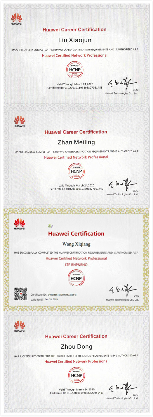 信息工程系通信技术教研室刘晓君、王锡强、战美玲、周栋四名专业教师高分通过了华为认证考试,获得华为认证网络资深工程师(HCNP)证书。