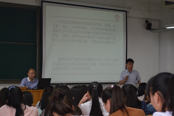 来自青岛众成海川电子有限公司的王军总经理和青岛上藤数码印花有限公司刘总经理为同学们做了精彩的演讲。刘总介绍了近几年数码印花技术在国内外的快速发展,指出其在国内所具有的广阔前景,并结合自身经历分享了依托数码印花技术创业的故事。