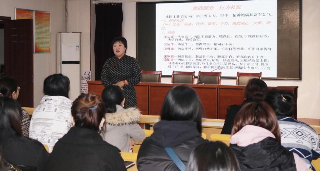 张欣老师从如何着装、服务礼仪知识、文明礼貌用语等方面给大世界社区的工作人员上了生动的一堂课。讲座中,张欣老师带领大家一起学习文明礼仪知识,针对当前社区服务中遇到的实际问题,张欣老师结合事例,讲解了社区服务中接人待物的重要性和注意事项。