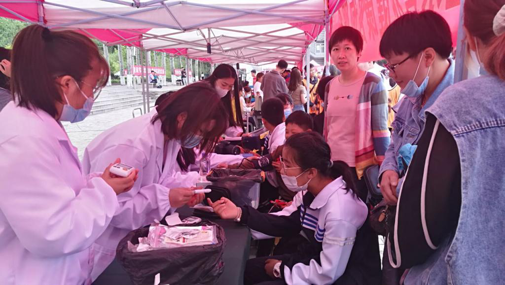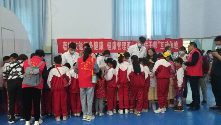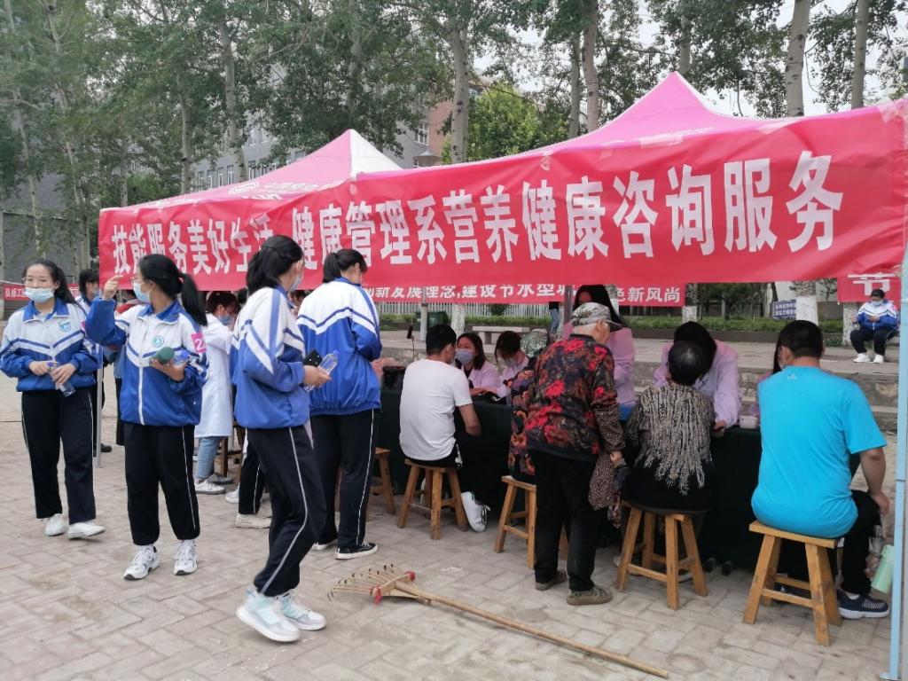 营养健康咨询服务共分为测血压、测血糖、刮痧和体质测定四个项目。项目得到了来访家长和老师们的喜爱,大家纷纷来到服务点进行测试。通过测试,服务的学生们对高血压和高血糖的人群给出了饮食和生活习惯的指导性建议。有部分老师进行了刮痧现场体验,大部分老师的主要问题集中在头部、颈椎和肩部。学生们帮他们找到头颈部痛点反射区,并提出了日常解决方案,得到了老师们的赞赏。