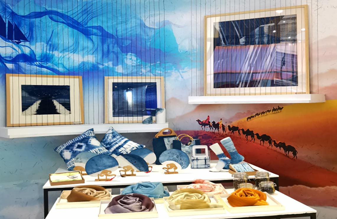 此次参展,我们共参展软装作品7 件,文创作品20件,所有的作品都是采用纯丝纯麻原材料的草木染作品,所用染料取自天然植物,在染色技艺上,采取古代的传统染色技法,并结合了现代的一些创意思维。古老的草木染艺术在这里“涅槃重生”,传统技艺在学校师生的手中走向了现代,焕发了新的旺盛的生命力。
