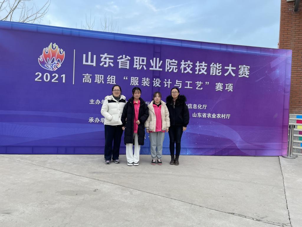 2021年11月26日—29日,2021年山东省职业院校技能大赛高职组服装设计与工艺比赛在山东科技职业学院举行。参加本次比赛的院校包括山东科技职业学院、青岛职业技术学院、威海职业学院等全省十所高职院校。本次比赛奖项设一等奖一名,二等奖二名,三等奖三名,我院由李晶、李珊珊老师指导的于亚慧、王窈两名同学组队参赛获得第四名三等奖的成绩。
